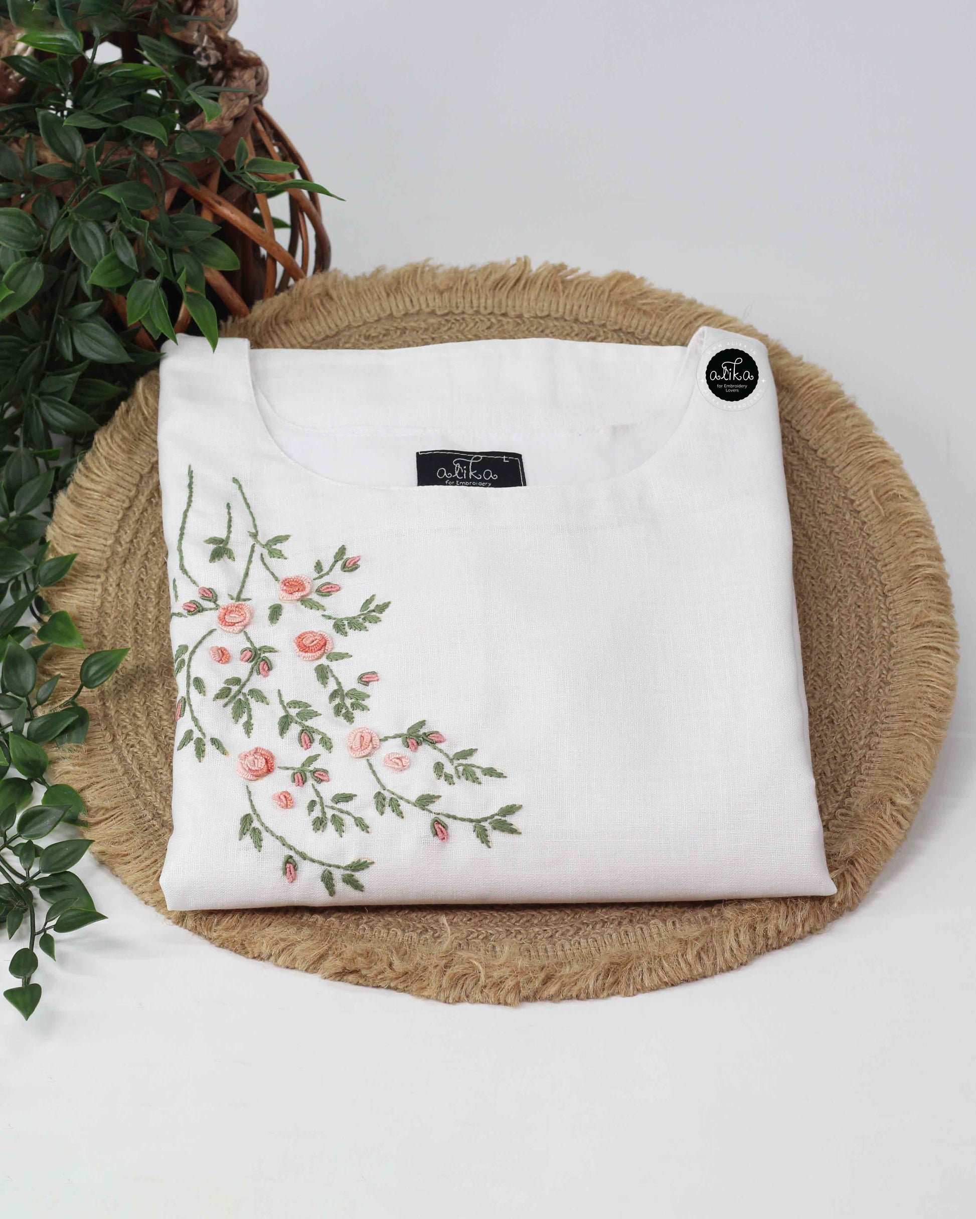 This stitched kurti is crafted from soft semi-linen fabric in a classic white shade. It features detailed floral hand embroidery on the neckline and the top of the sleeves.