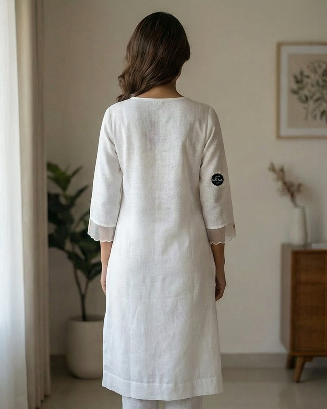 This white stitched kurti features floral embroidery on the neckline and sleeves. The fabric offers a clean and comfortable feel. It is suitable for office wear, daily use, and light festive occasions.